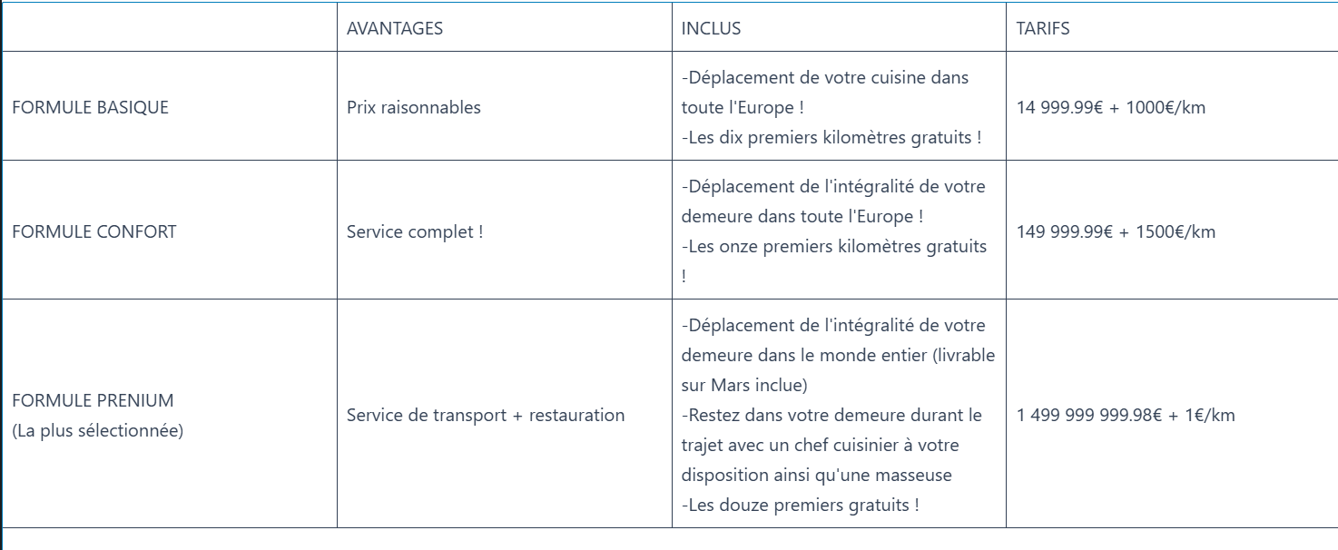 | FORMULE PRENIUM (La plus sélectionnée) | Service de transport + restauration | -Déplacement de l’intégralité de votre demeure dans le monde entier (livrable sur Mars inclue) -Restez dans votre demeure durant le trajet avec un chef cuisinier à votre disposition ainsi qu’une masseuse -Les douze premiers gratuits ! | 1 499 999 999.98€ + 1€/km |